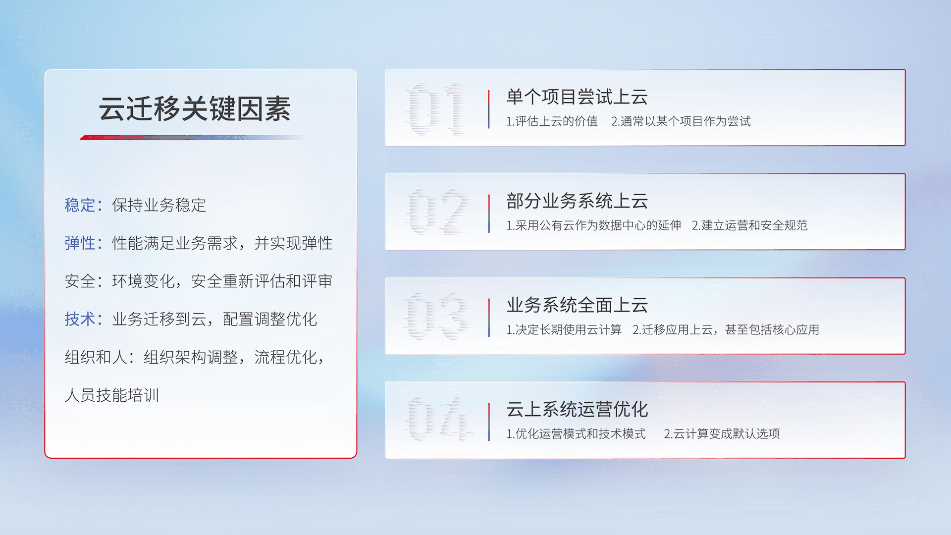结合实际业务,,,从规划设计、、云平台选型、、云原生改造、、、数据迁移、、集成交付,,,迁移全过程为客户识别最佳上云路径,,,,做好风险识别管理,,,,设计网络架构、、身份权限、、、、安全审计合规、、操作审计、、、、日志审计、、、监控告警策略、、多站点容灾设计等,,,,对云上基础设施进行整体规划,,,提升IT治理水平,,,以满足弹性、、、高可用、、、、高性能的需求。。