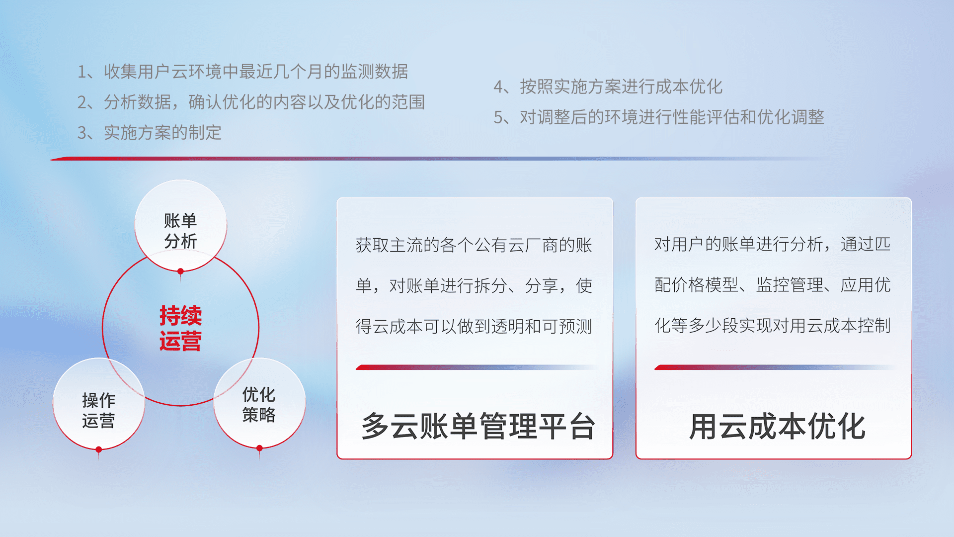 通过多云纳管,,,,以统一的资源数据模型把客户的云资源进行抽象和封装,,,进而实现对多云资源的统一操作,,保障云资源管理的可靠性、、稳定性与可用性。。。量身定制化运维内容,,,,配置、、、开发运维、、、、补丁管理、、、、备份、、监控、、、认证和访问管理、、、、审计和日常巡检等,,保障在用云过程中的可靠度,,,,稳定度以及高可用率。。。。